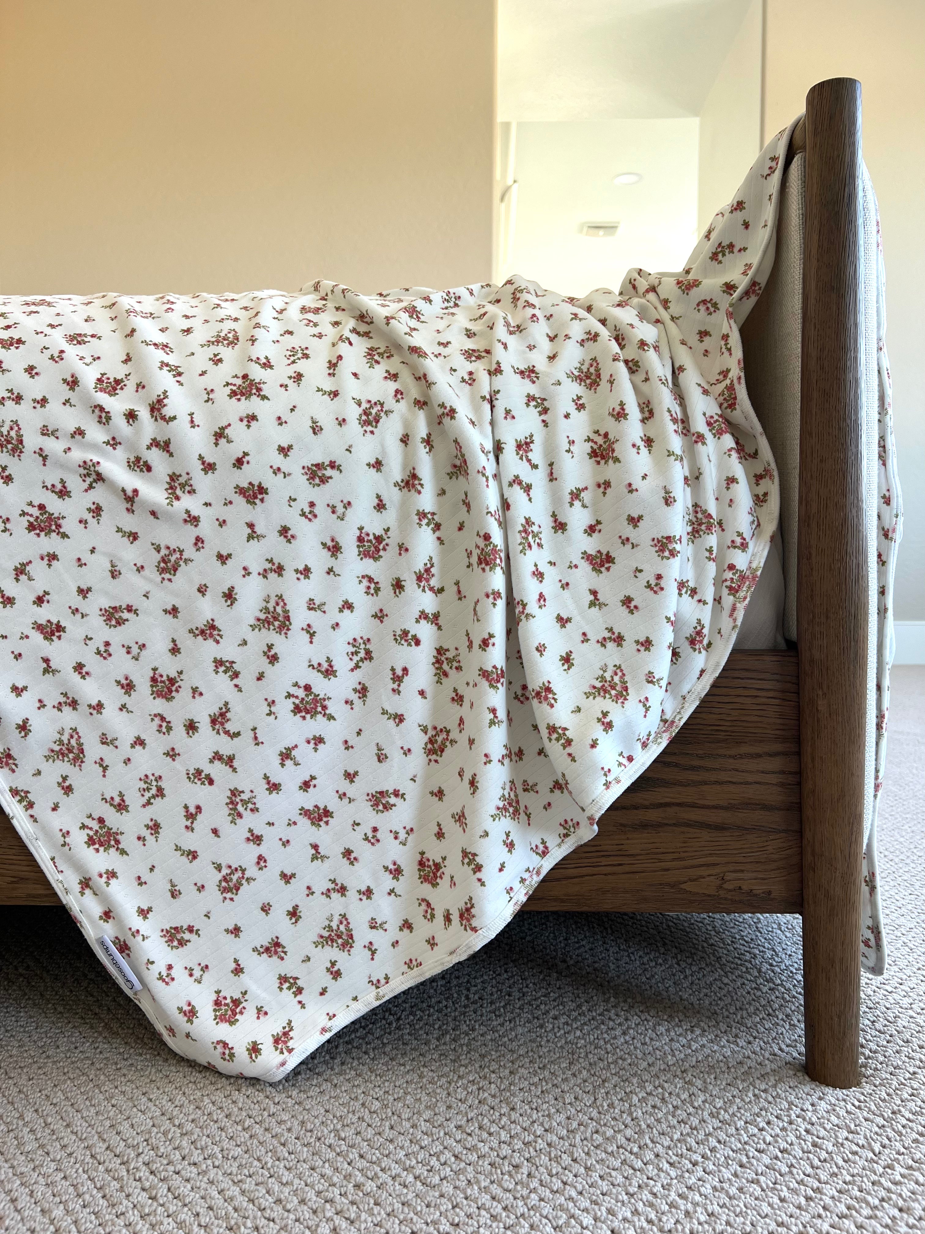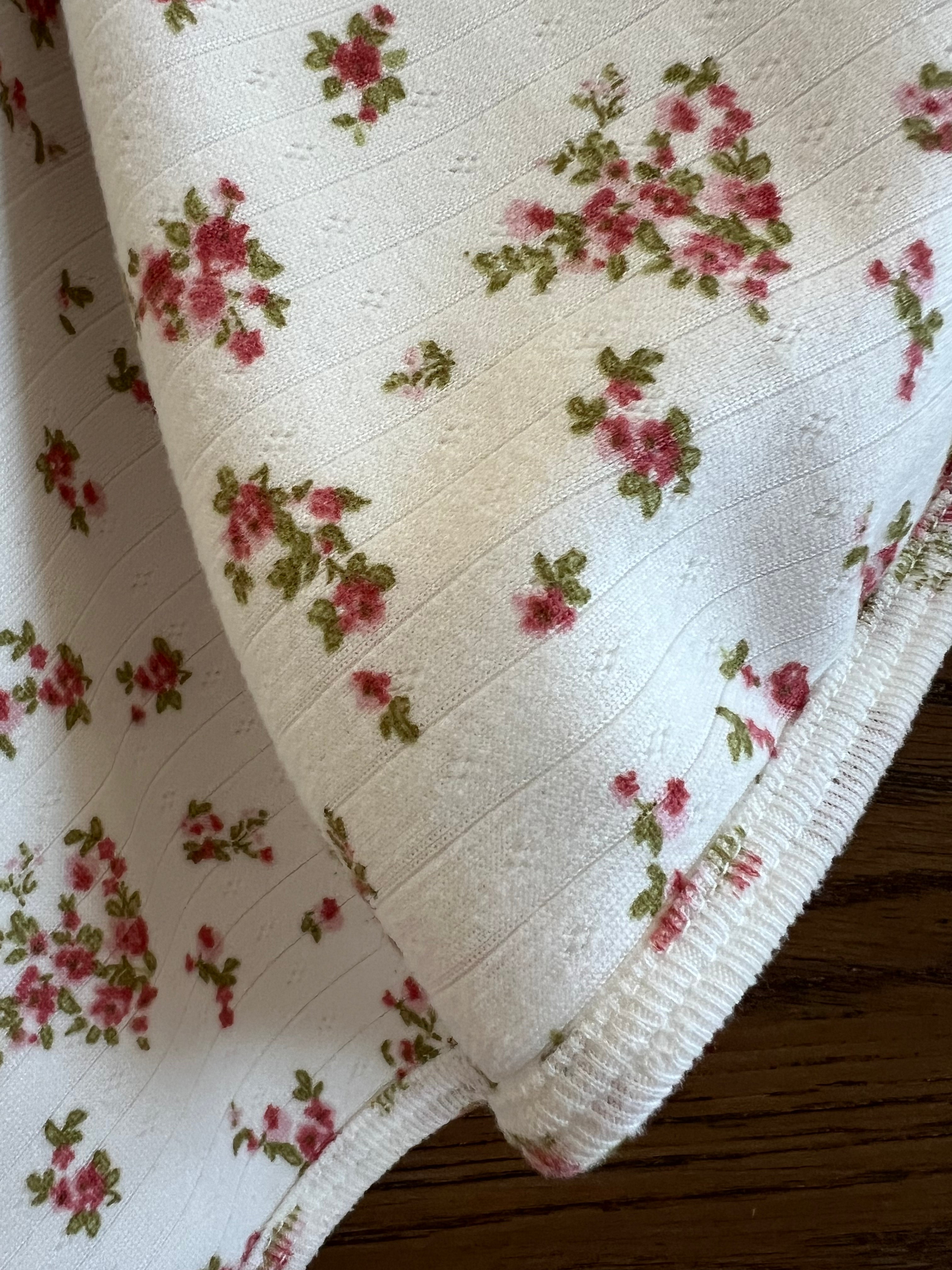- white w/ red and pink flowers ribbed pointelle, binded and backed in same