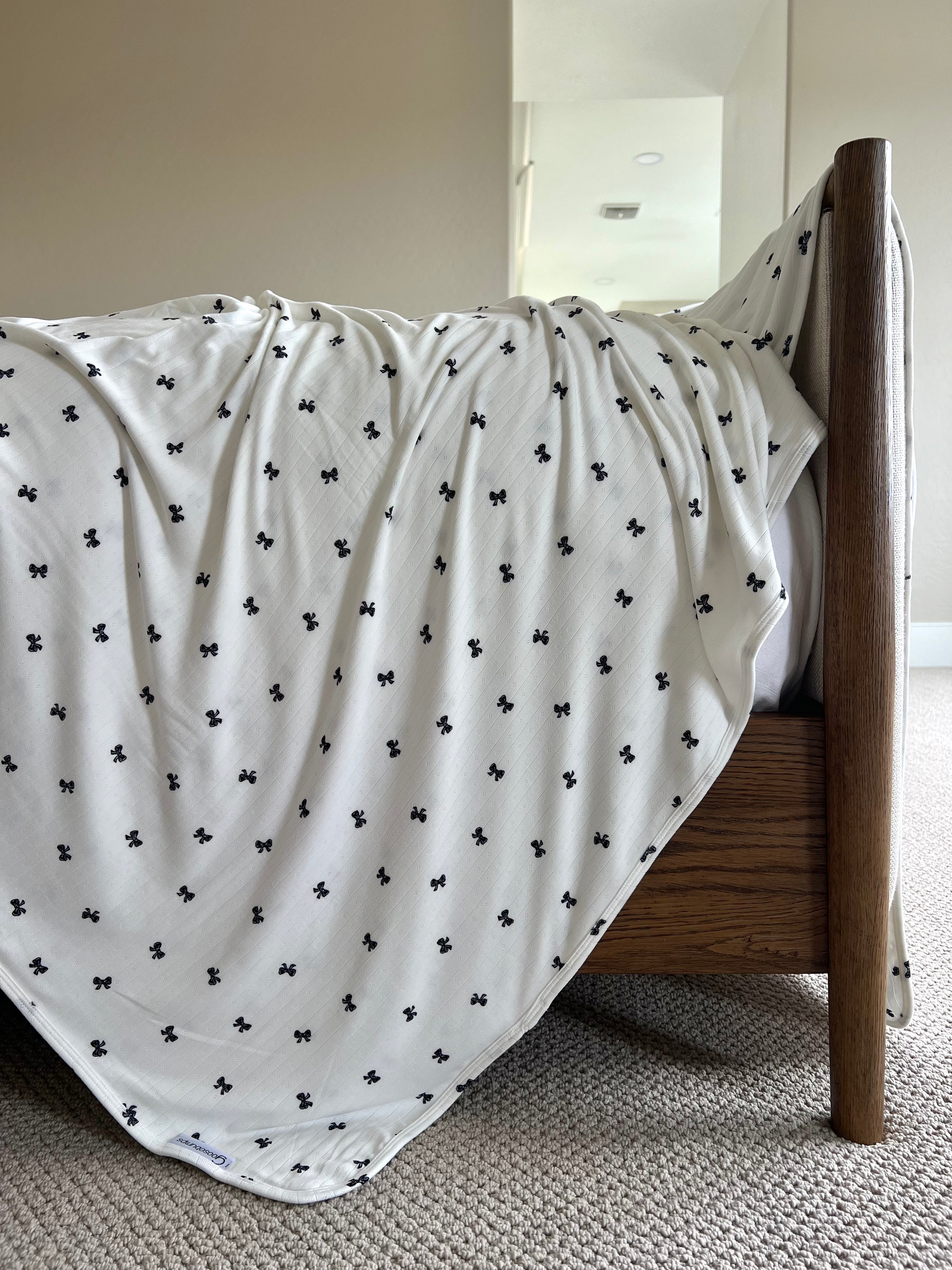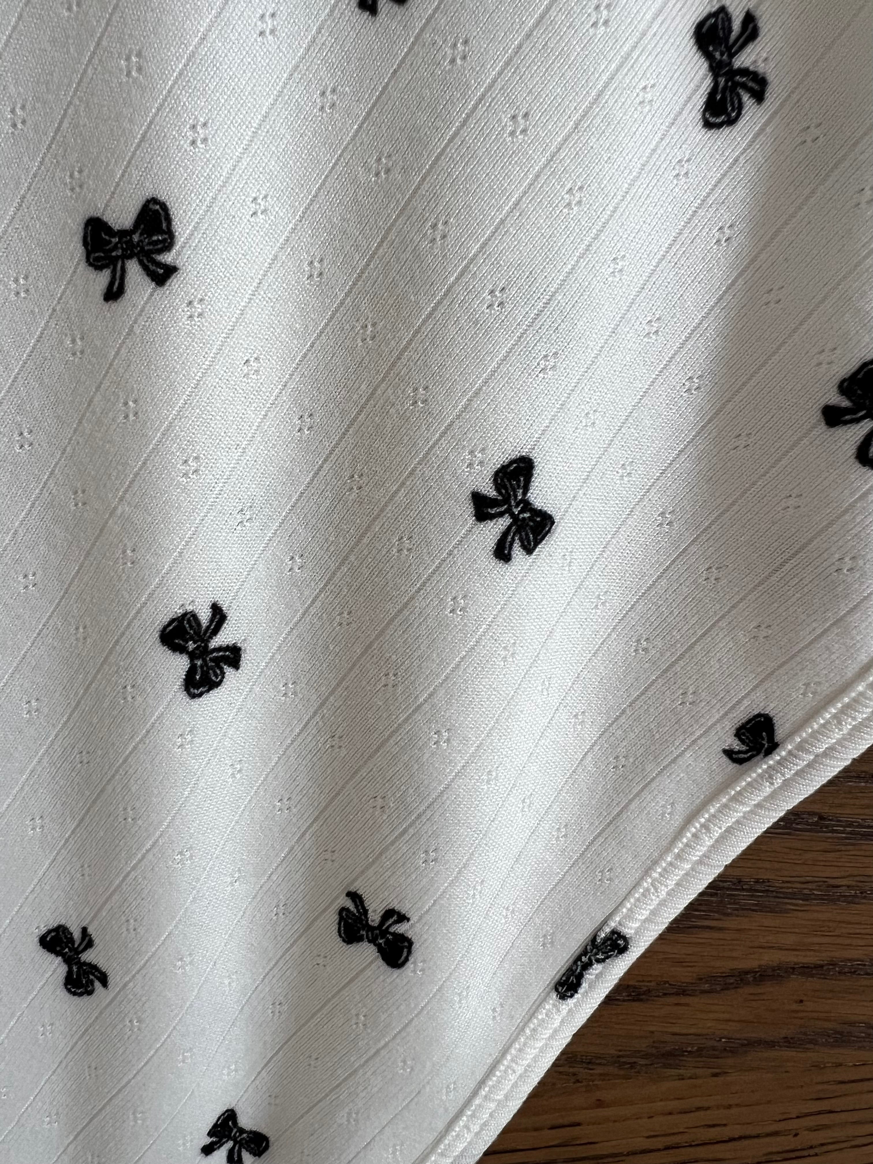 - white w/ little black bows ribbed pointelle, binded and backed in same