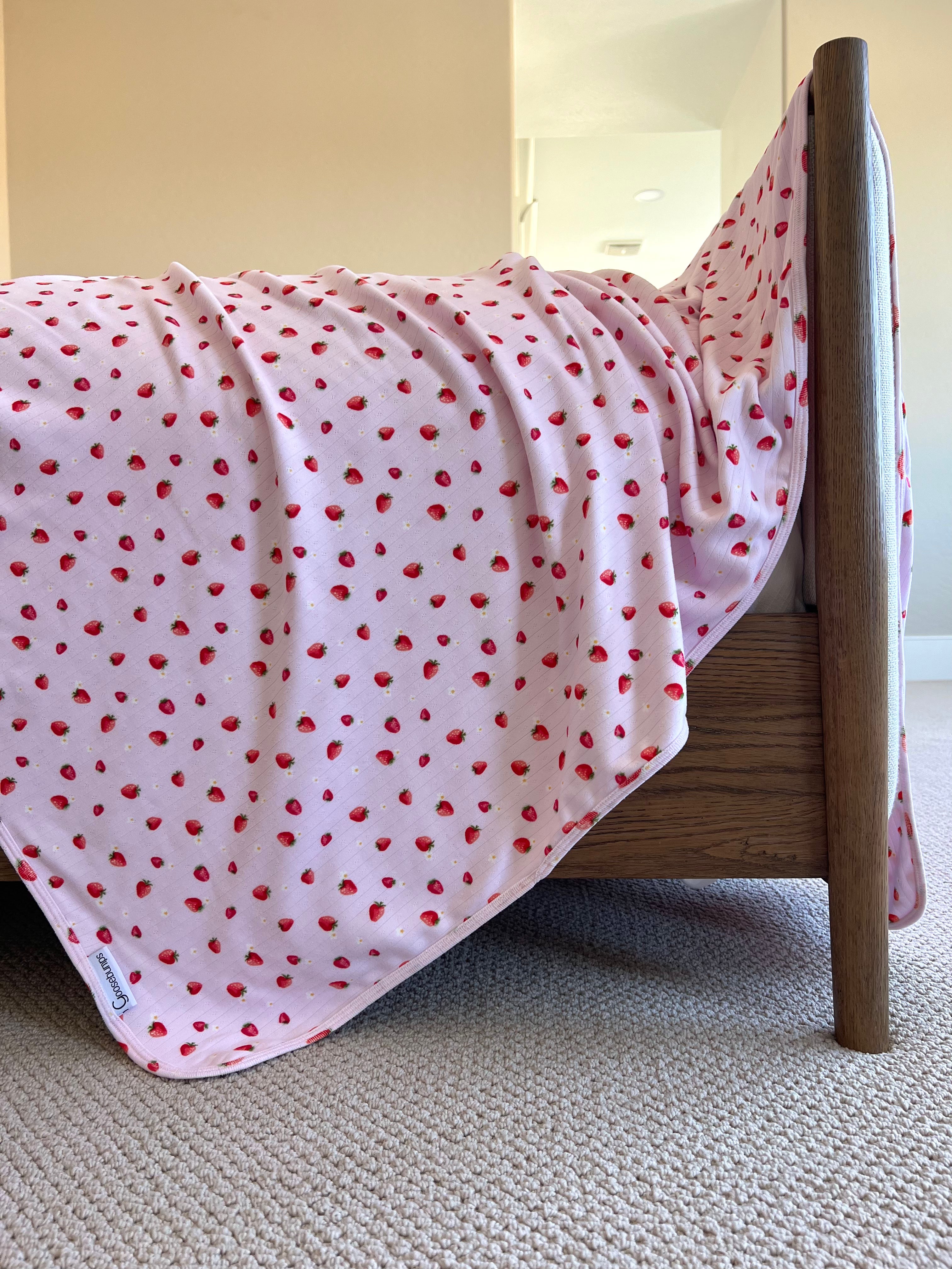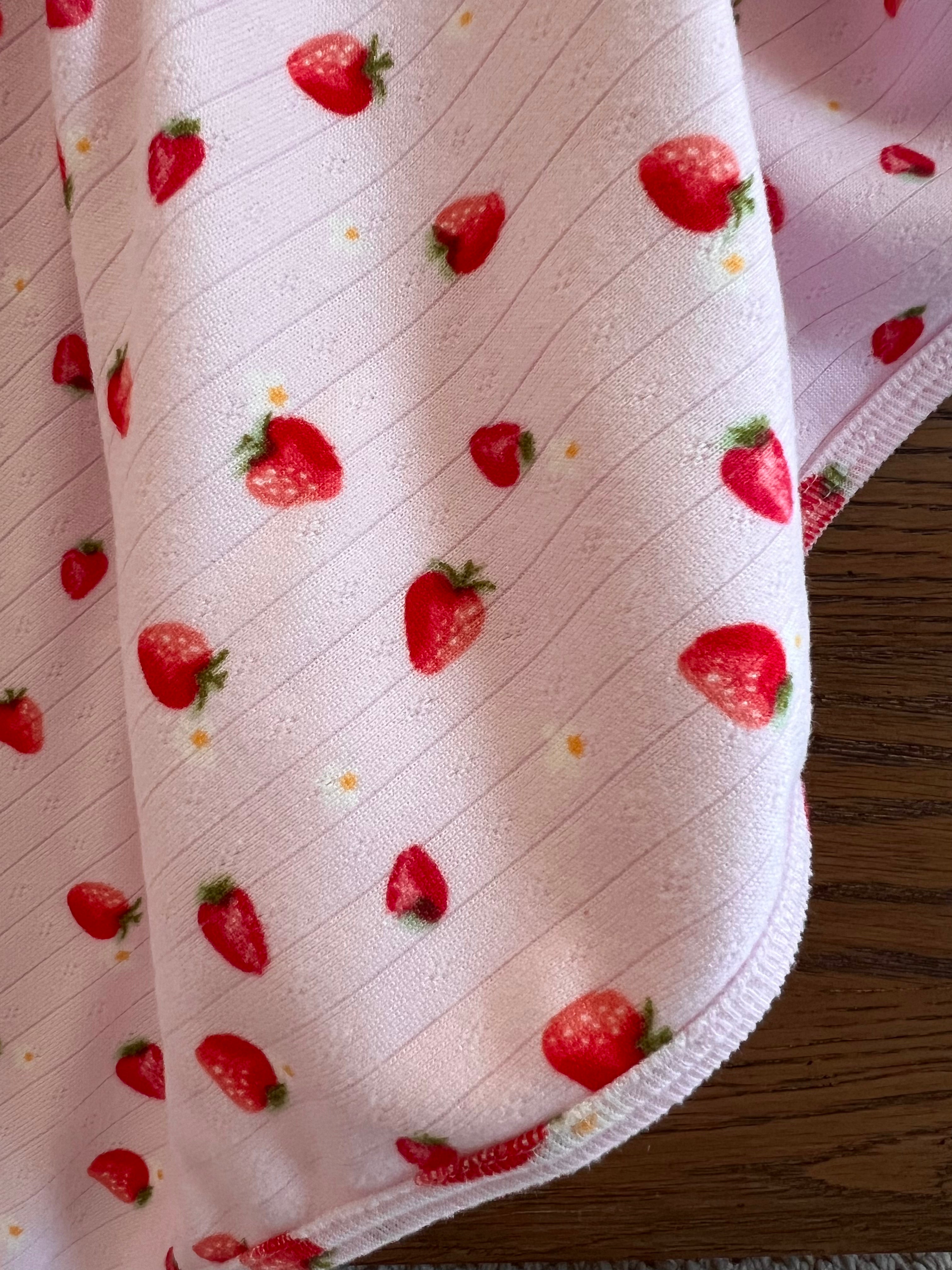 - pink w/ strawberry print ribbed pointelle, binded and backed in same