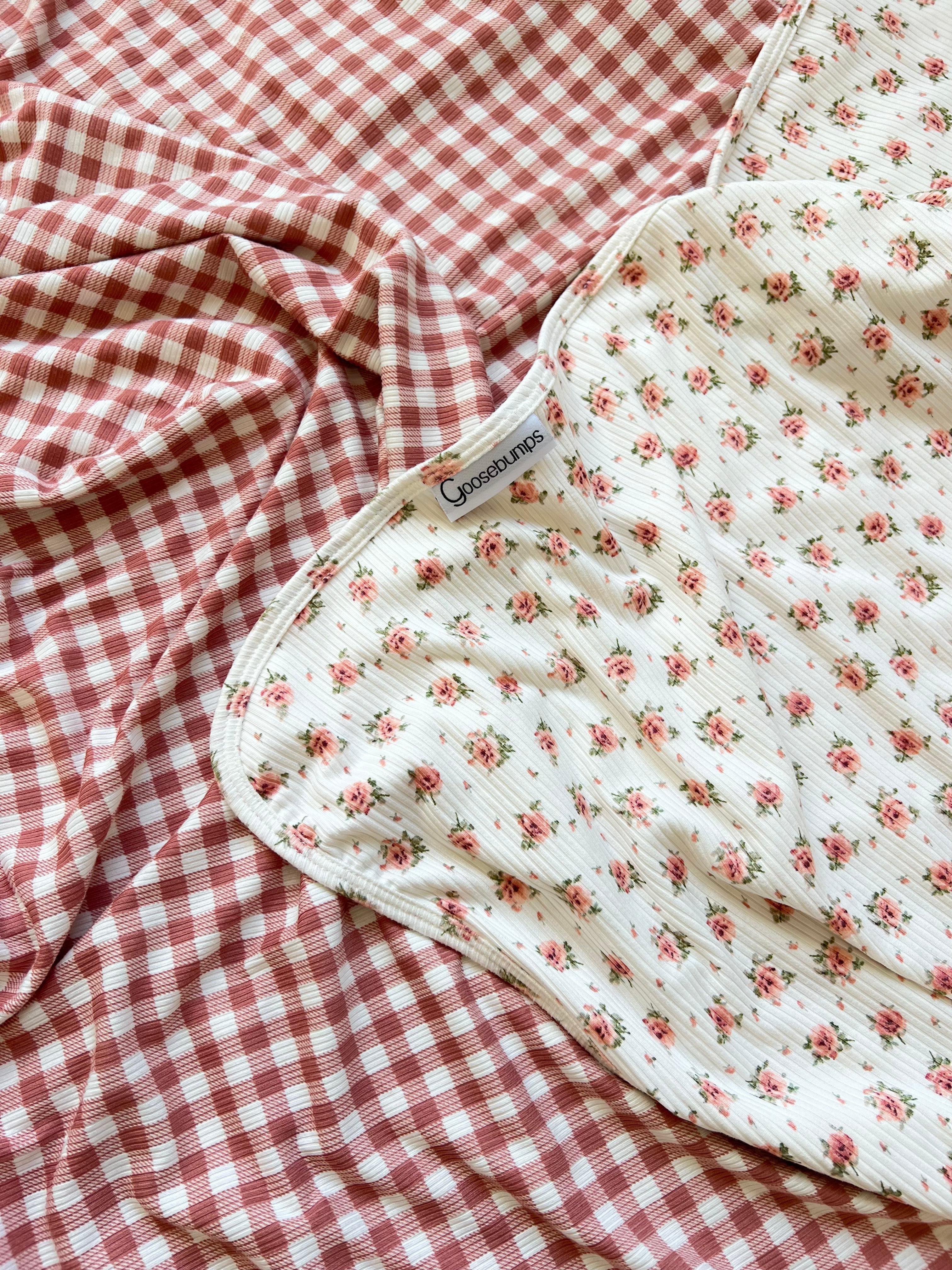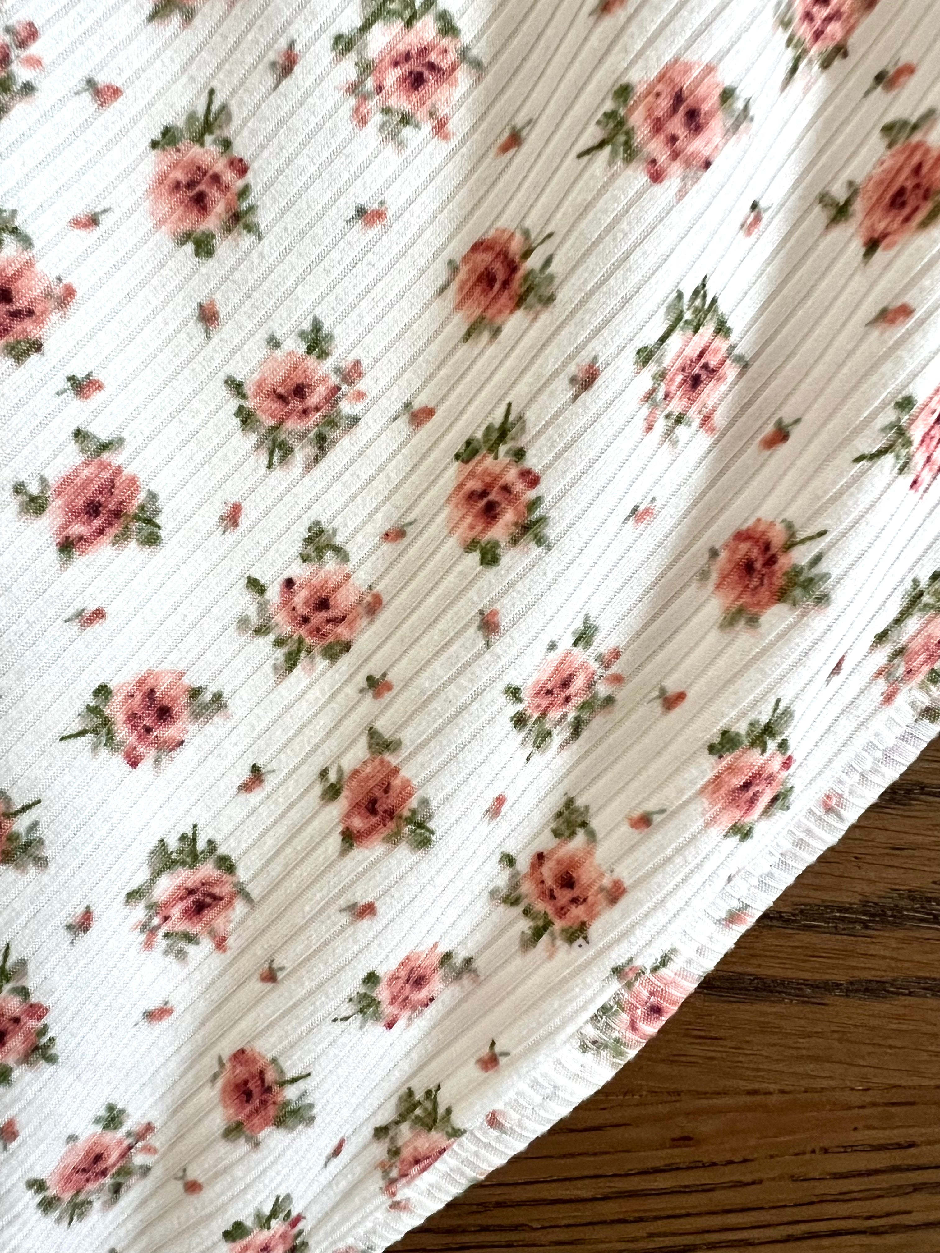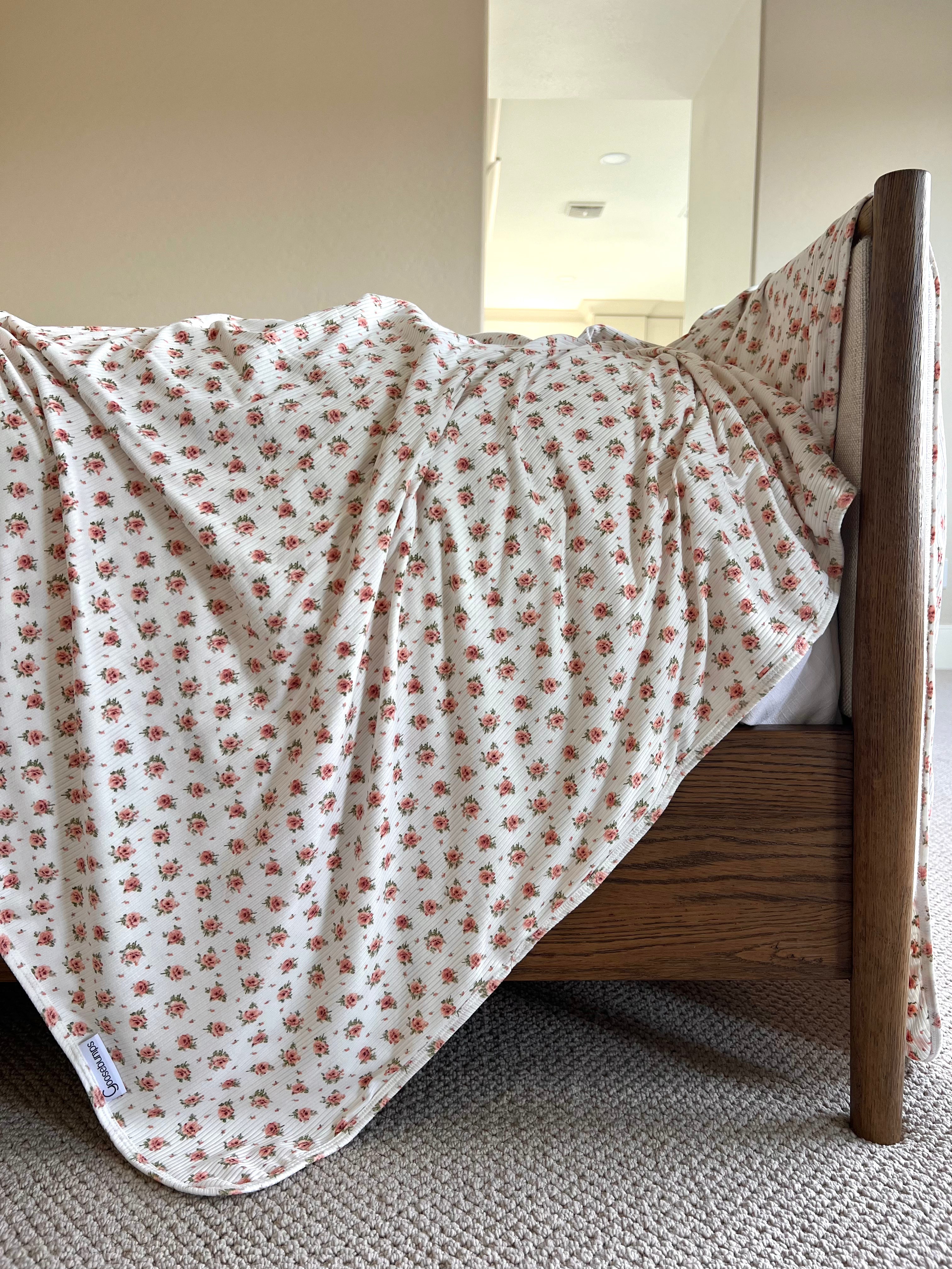 - ivory with pink and sage ribbed floral print, binded and backed in same