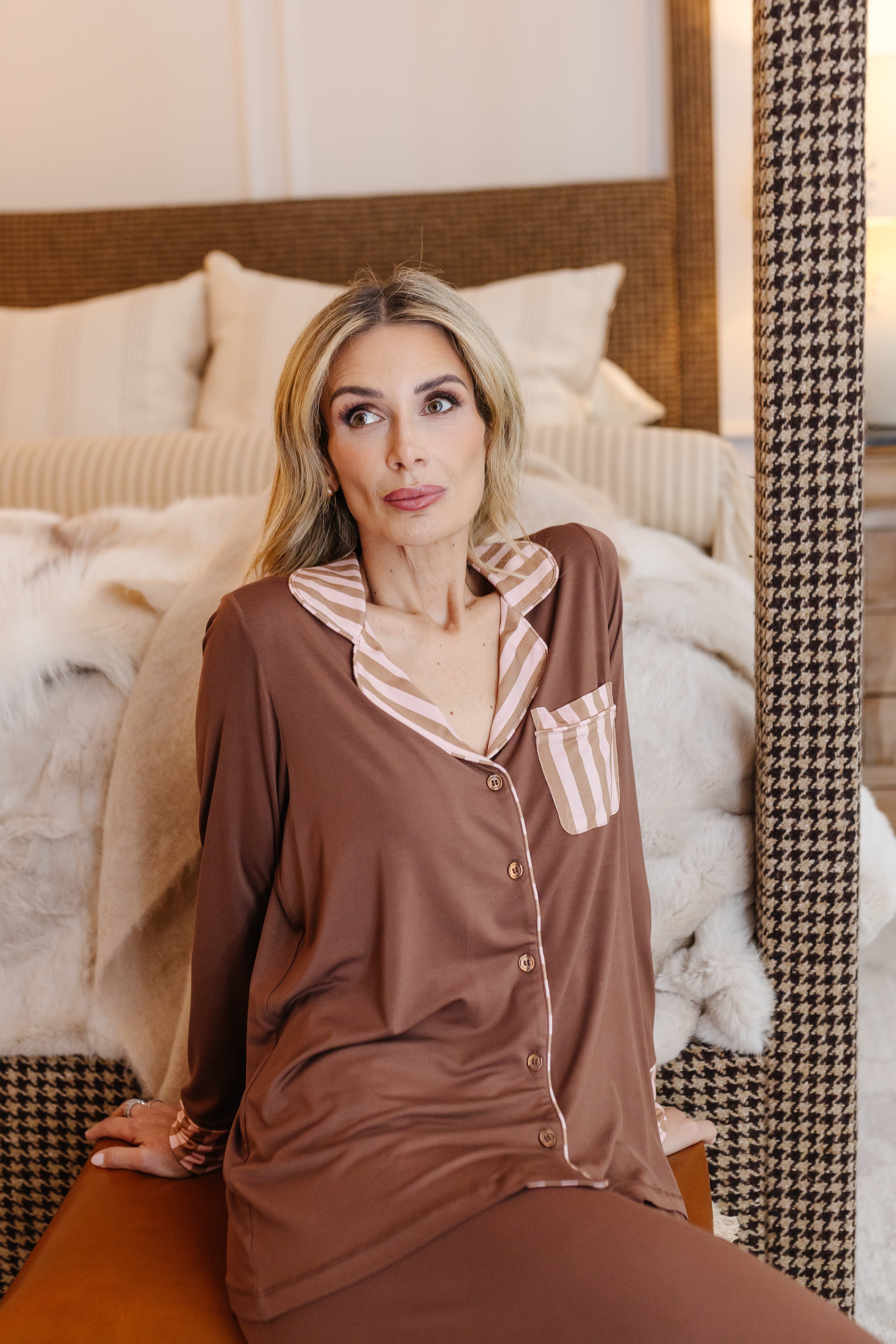 Unwind in absolute comfort with our classic top adorned with a button closure, notched collar, gracefully long sleeves and accented with piping for a touch of timeless elegance. Paired perfectly with our matching pant boasting a cozy elastic drawstring waist, completed with ties and complementing piping details. Every aspect is designed to enhance your lounging experience, the Goosebumps way.