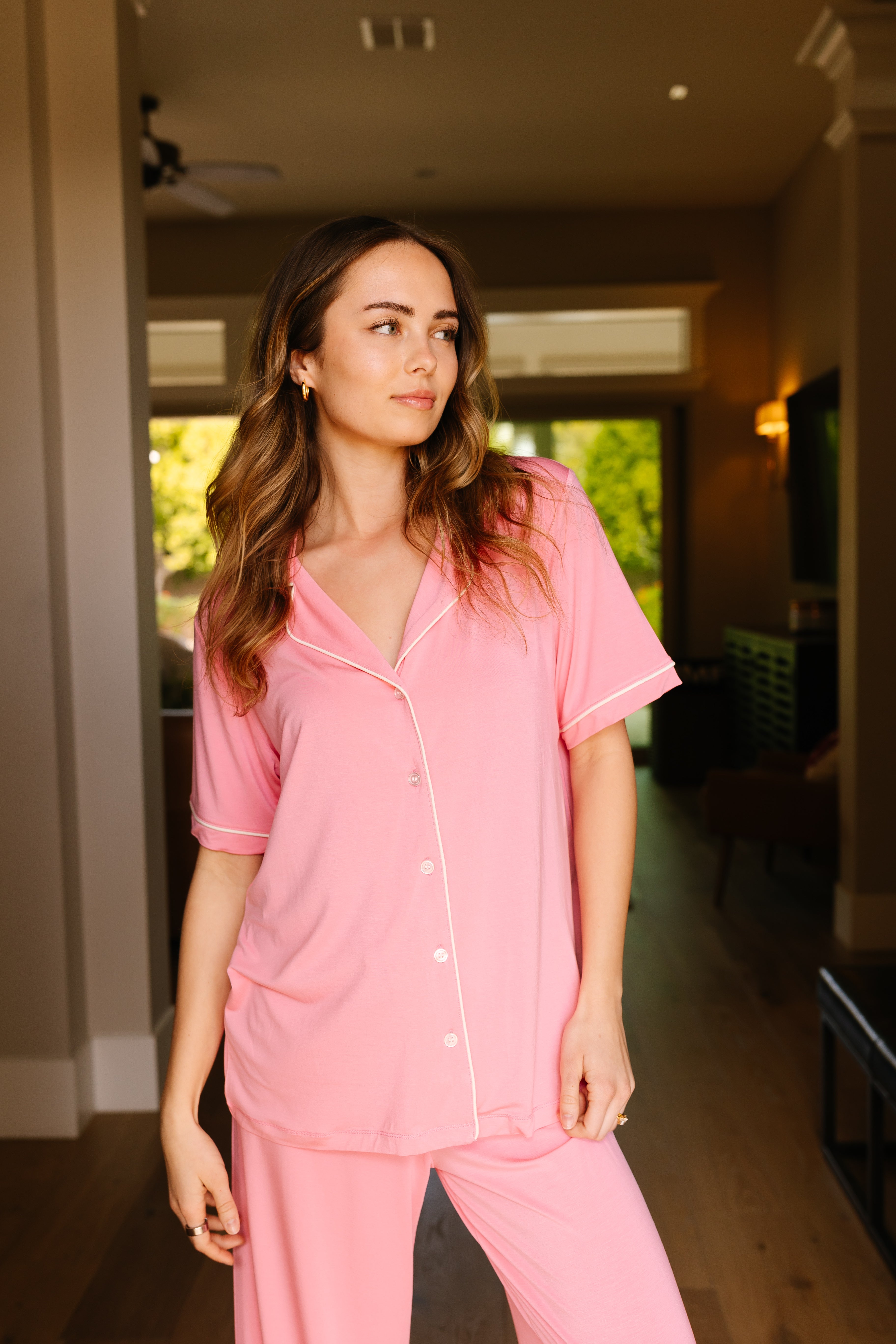 Unwind in absolute comfort with our classic top adorned with a button closure, notched collar, graceful short sleeves and accented with piping for a touch of timeless elegance. Paired perfectly with our matching pant boasting a cozy elastic drawstring waist, completed with ties and complementing piping details. Every aspect is designed to enhance your lounging experience, the Goosebumps way.