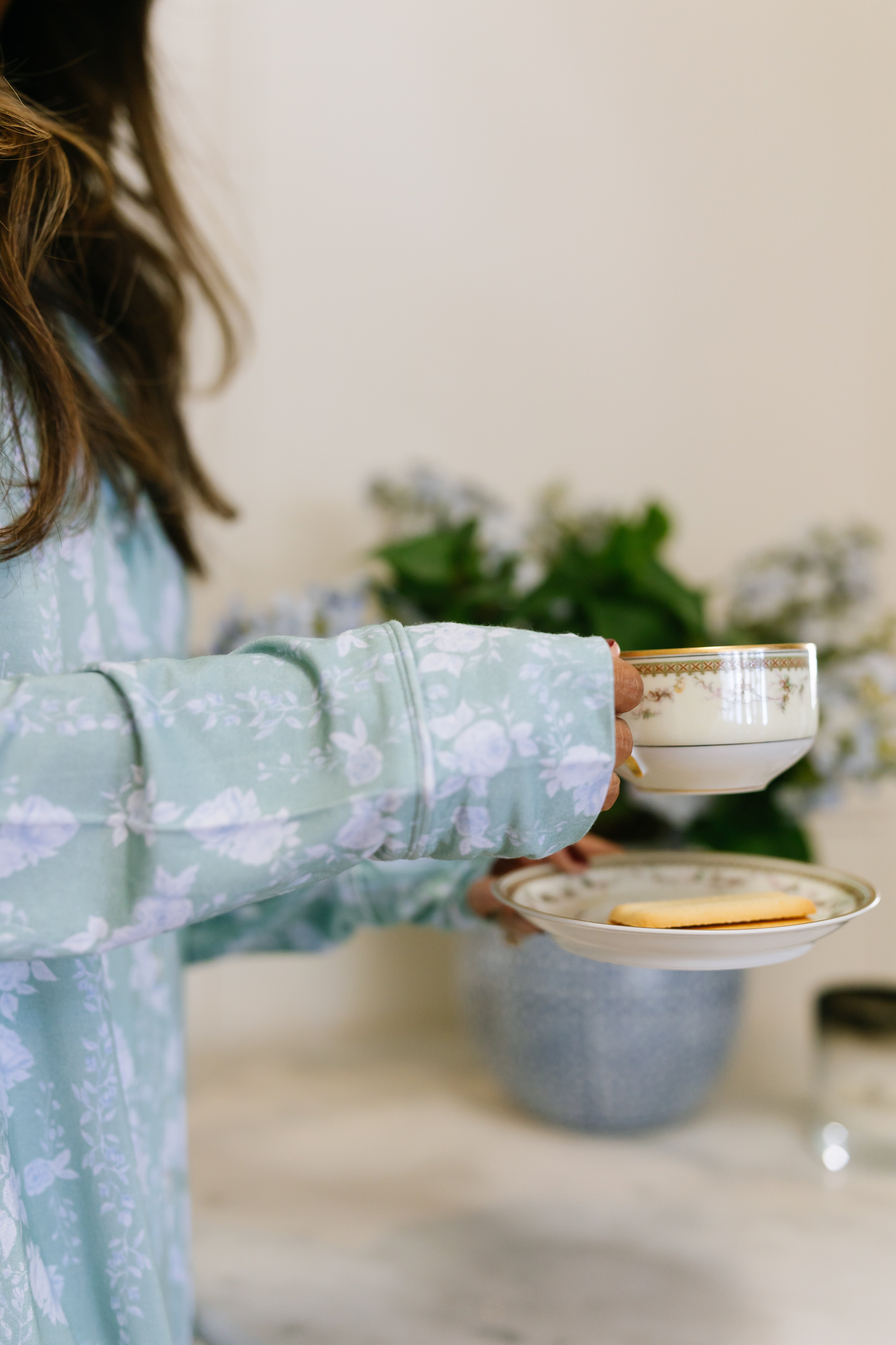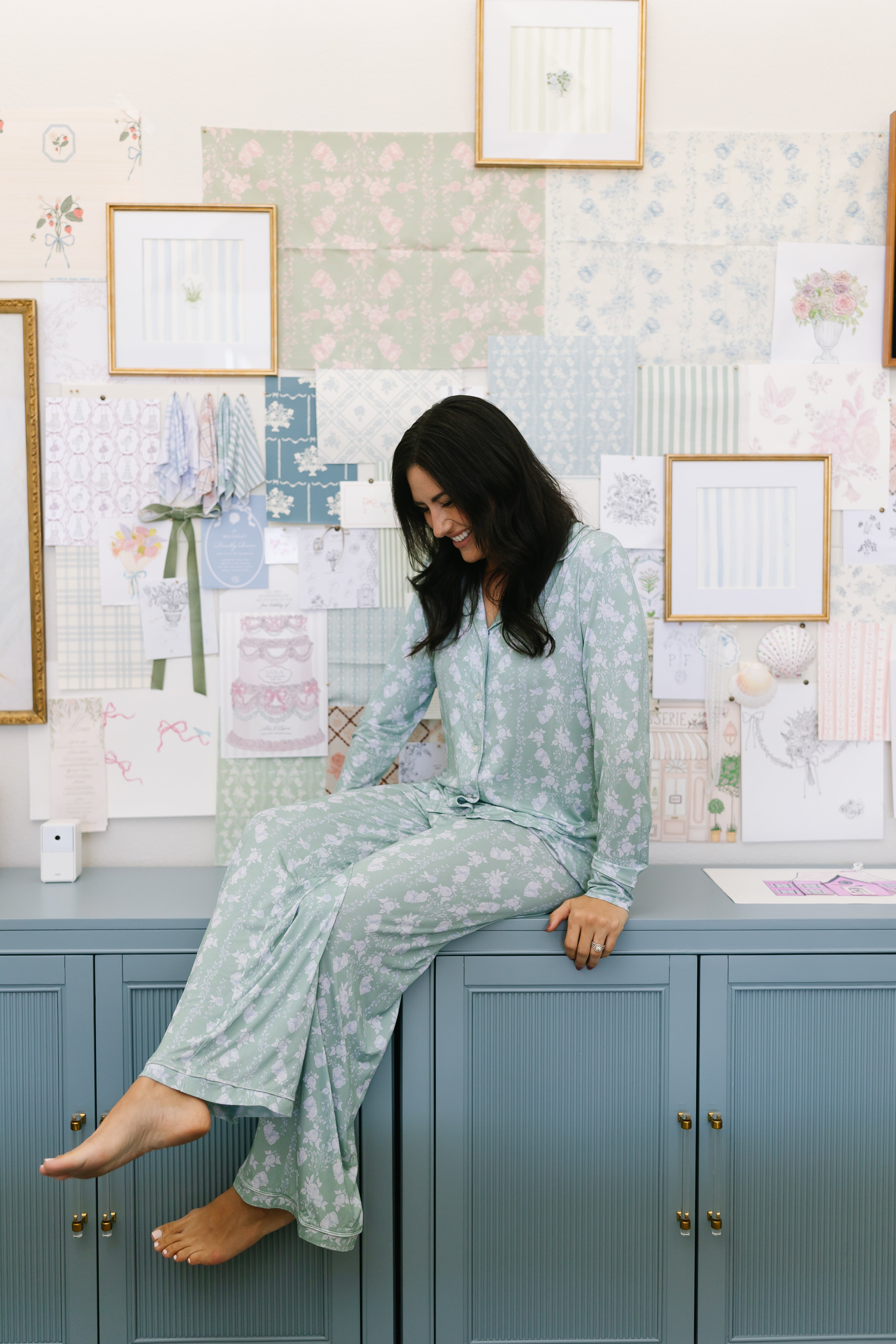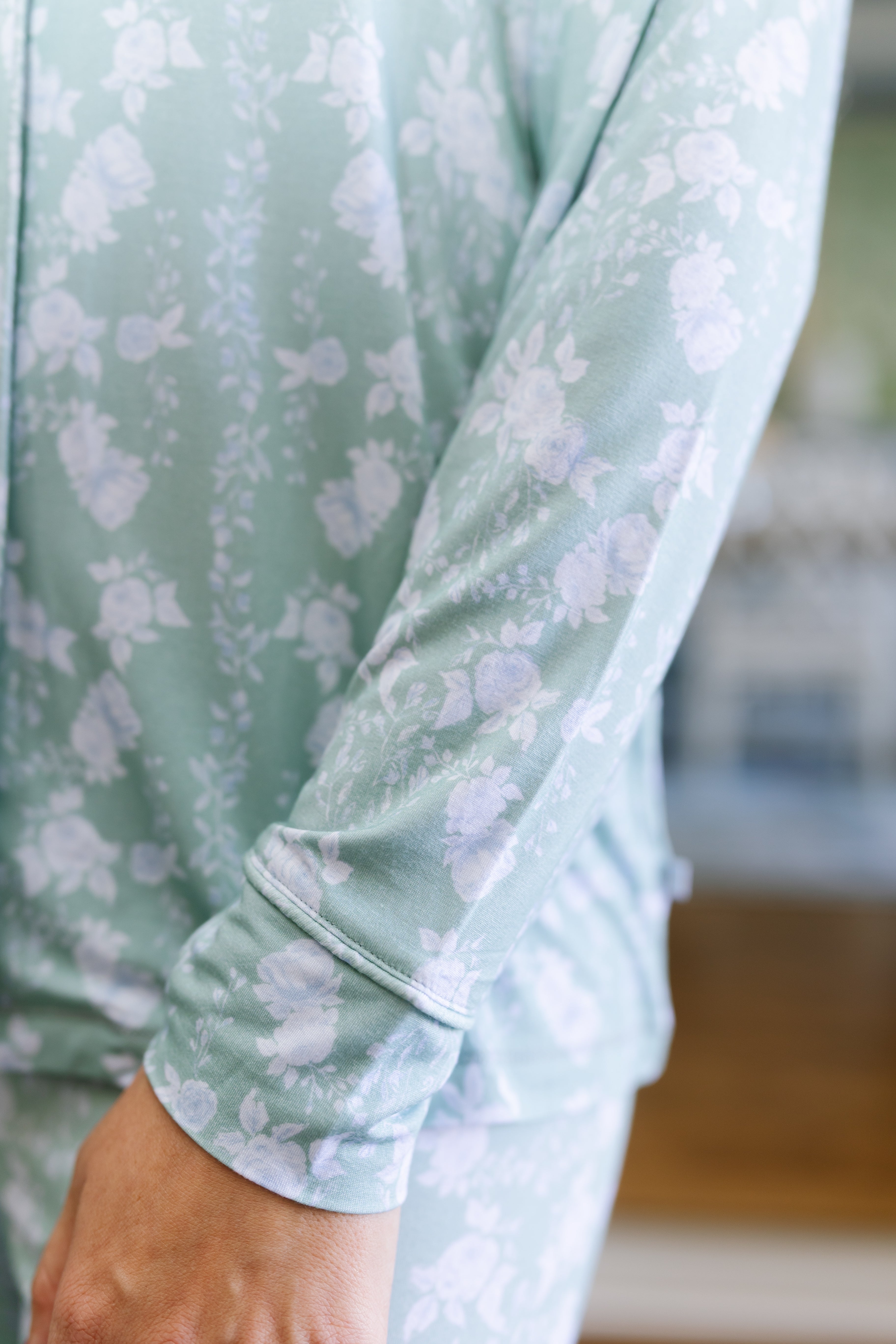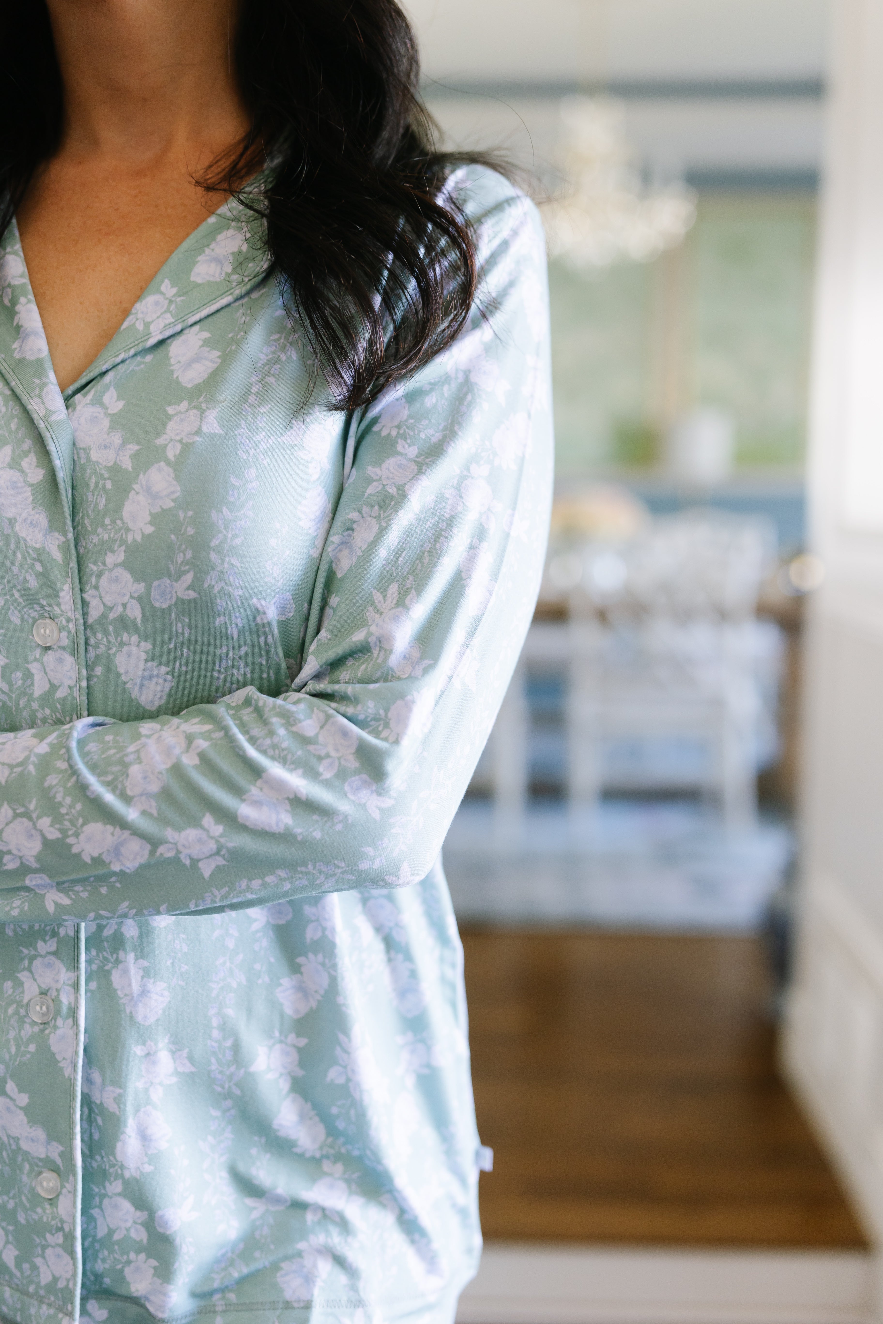This women's pajama set comes with the classic top and matching pant. The top features a button closure, notched collar, elegant piping throughout and long sleeves. The pant has a comfortable elastic drawstring waist.
