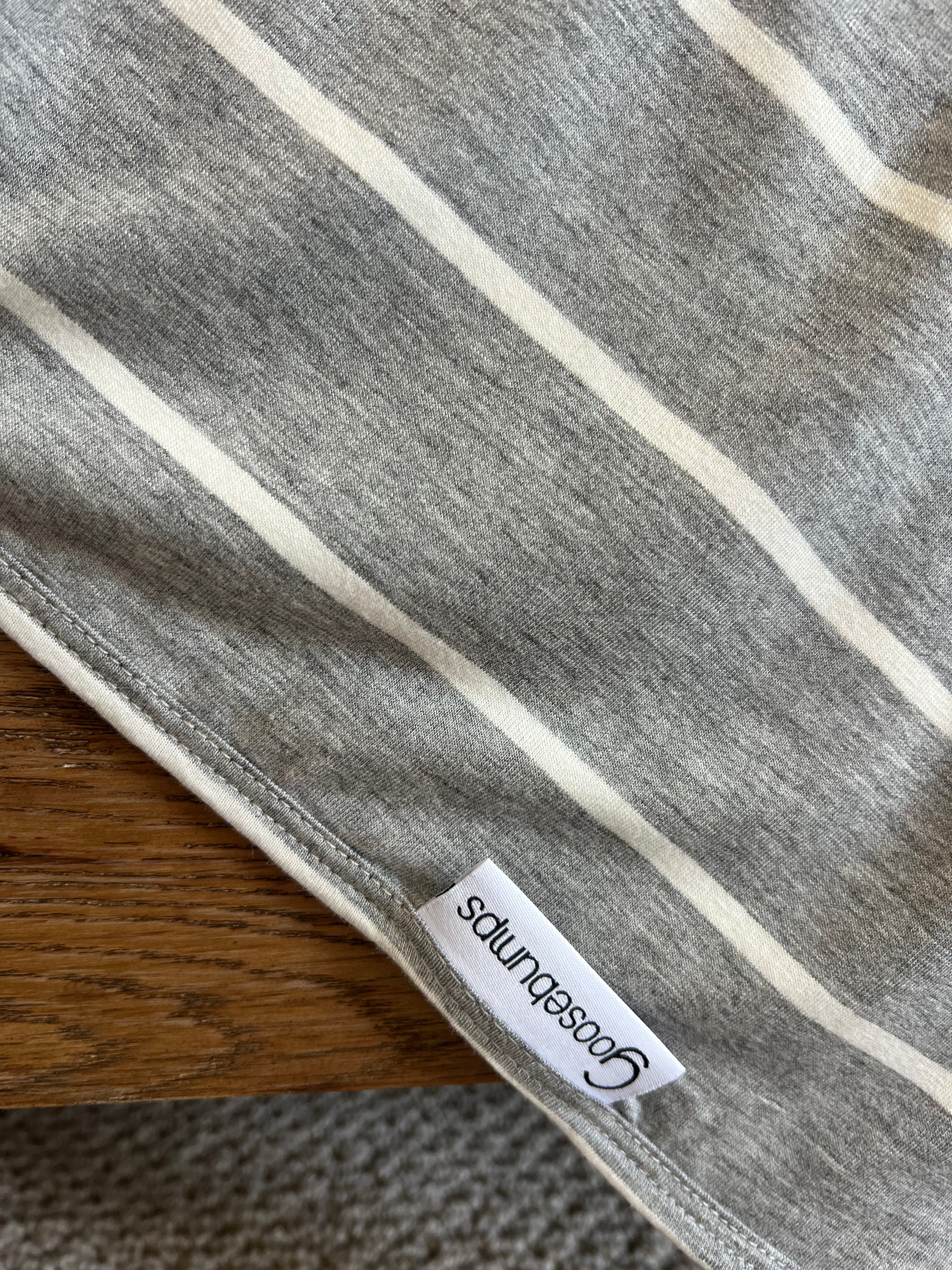 - heather grey and white stripe pattern, binded & backed in same