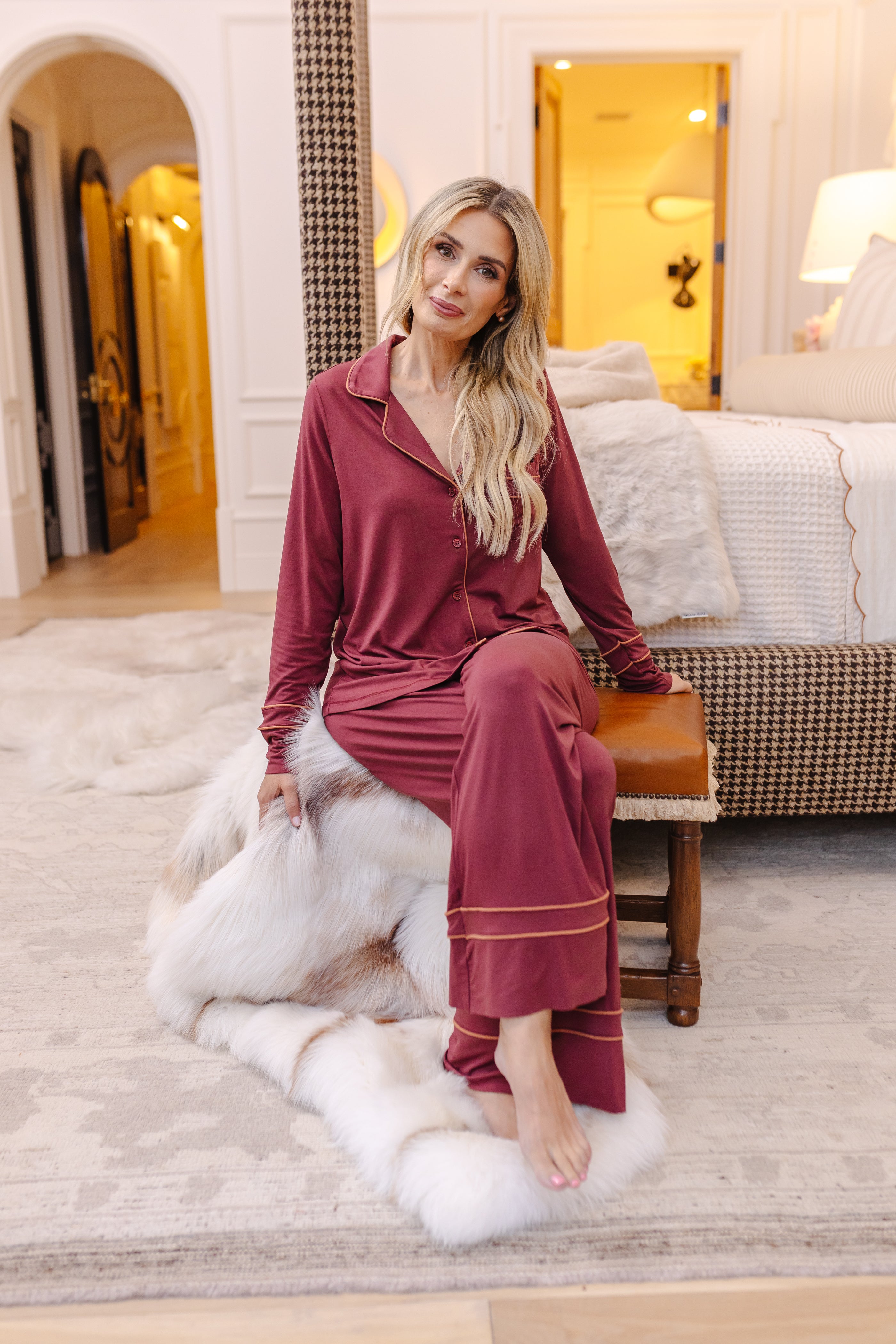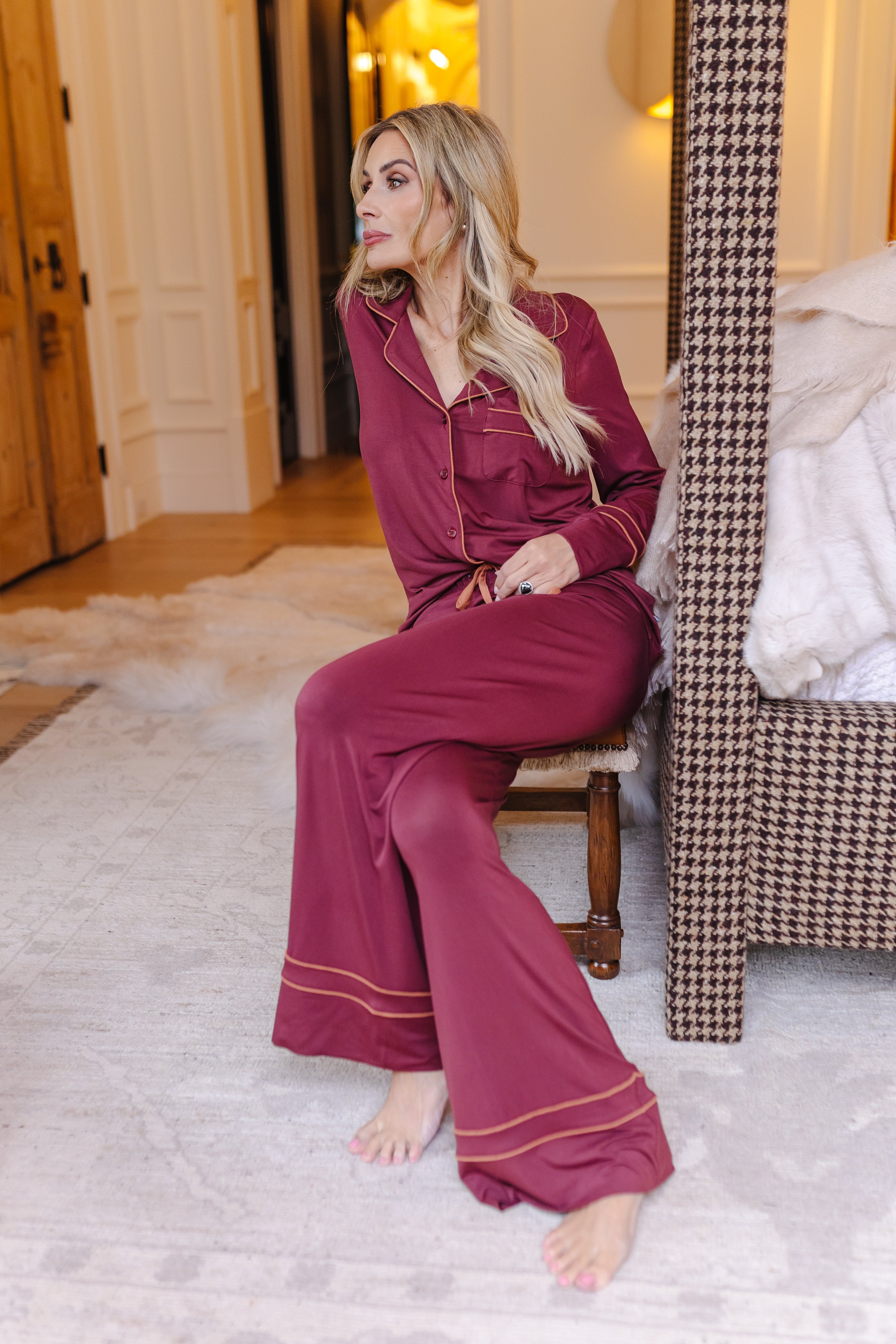 Unwind in absolute comfort with our classic top adorned with a button closure, notched collar, gracefully long sleeves and accented with piping for a touch of timeless elegance. Paired perfectly with our matching pant boasting a cozy elastic drawstring waist, completed with ties and complementing piping details. Every aspect is designed to enhance your lounging experience, the Goosebumps way.